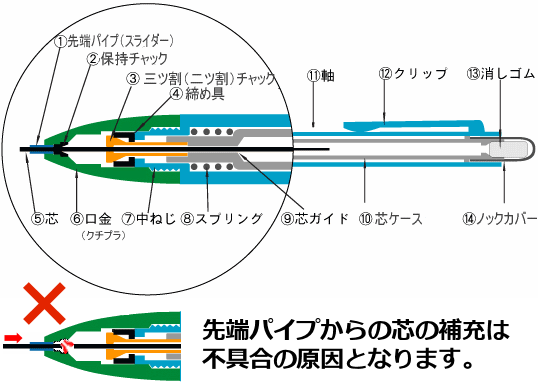 上図の「①先端パイプ」から芯を補充すると「②保持チャック」の位置がずれて、ノックをしたときに芯が出てこなくなる場合があります。
