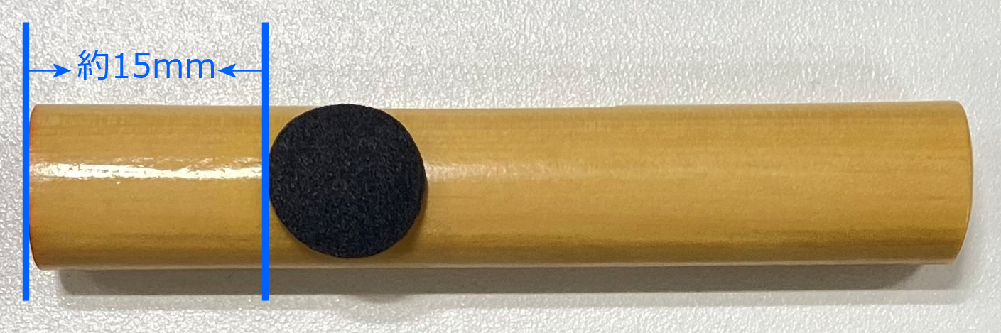 画像のように印面から約15mmの所からシールを貼り付けてください。 ※裏面の同一の二か所に貼ります。