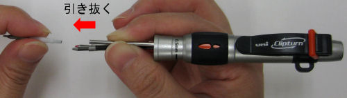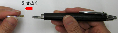 シャープの先端部を繰り出した後、先軸や口金を回して外します。この際、ボールペンのペン先によるインク付着にご注意ください。