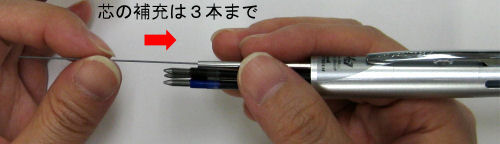 芯ケースの中へ芯を補充します。芯の補充本数はチャックが保持している芯も含めて合計3本以内をお勧めしています。補充された芯が多いと、芯ケースからペン先へ芯が繰り出される際、芯ガイドで芯詰まりを起こす場合があります。