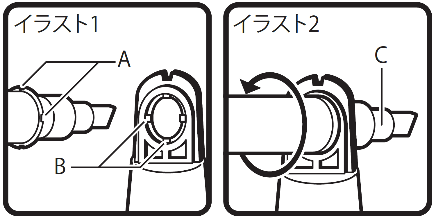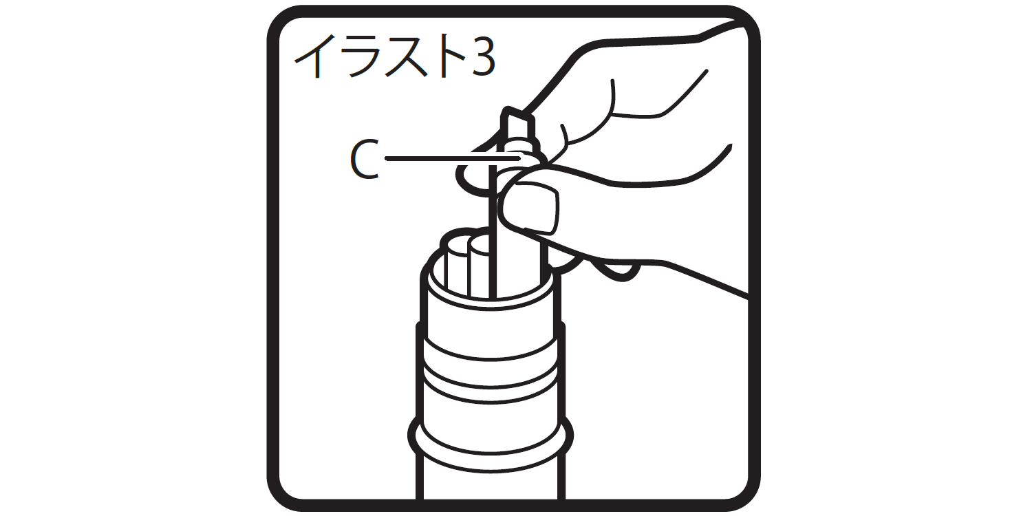 ②「イラスト2」のようにペンを矢印の方向に回し、C部(ペンの先軸)を外します。