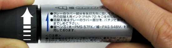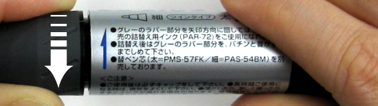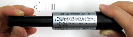 - キャップをしたまま、細字側のグレーのラバー部分を軸の矢印の方向に回してはずします。