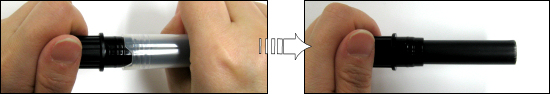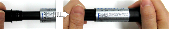 - (1)と逆の手順です。容器のキャップをはずし細字側のグレーのラバー部分を軸本体に回して取り付けます。この時パチンと音がするまでしめてください。