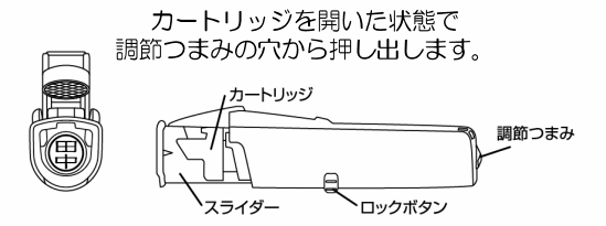 「調節つまみ」の中心の穴から、爪楊枝くらいの太さの細い棒を入れて印鑑を押し出します。