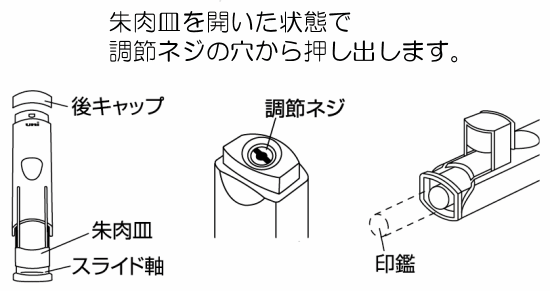 「スライド軸」を押し込んで朱肉皿が開いた状態にし、「後キャップ」の中にある「調節ネジ」の中心の穴から、爪楊枝くらいの太さの細い棒を入れて印鑑を押し出します。この時、先端のとがったもので押し出すと、けがをしたり印鑑に傷をつけますのでご注意ください。