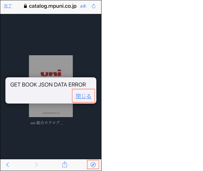 - ① スマートフォン:エラーメッセージを閉じ、画面の下のsafariなどのブラウザボタンを押す。