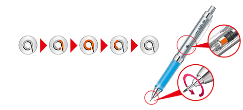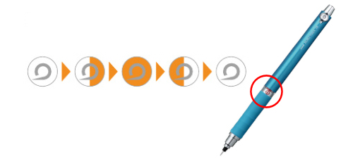 芯が回っている状態は、マーク(中ギア)の動きで確認ができます。ギアの位置は上の図の他に、下の2種類があります。どちらも芯の回転はクルトガマークの色が変わることで確認できます。