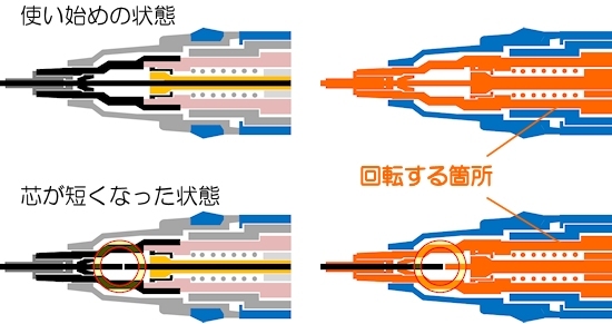 クルトガは、文字を書くときの筆圧を利用して、「内部機構と繋がった芯」が一画書く度に少しずつ回転し芯の先が尖ります。そのため、短くなって「内部機構から離れた芯」は、回転しても「芯の先を尖らせる抵抗」を内部機構で支えられないため、筆圧で元に戻ってしまう(回転しきらない)場合があります。