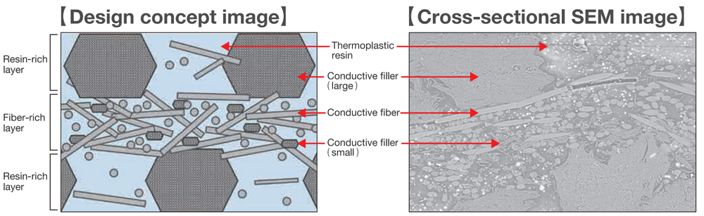By optimizing our original conductive filler, conductive fibers and thermoplastic resin we have achieved a high level of balance between each physical property.