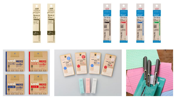 Paper packaging is used for the following products: "Long-lasting refills" (upper left photo) released in November 2021, "Jetstream Multicolor Multifunction Refills" (upper right photo) renewed in November 2022, "Sharpie Refill uni Refill" (lower left photo) released in February 2023, "Sharpie Refill uni Refill S" (lower middle photo) released in May 2024, "Sharpie Refill S" (lower left photo) released in May 2024, "Sharpie Refill S" (upper right photo) renewed in November 2023. (middle of the bottom row in the photo), which will be released in May 2024, are packaged in paper packages.