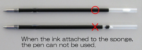- As shown in the photo above, push the sponge behind the refill toward the pen tip, and when the ink comes in contact with the ink attached to the sponge, the air going to the pen tip will not be transmitted.