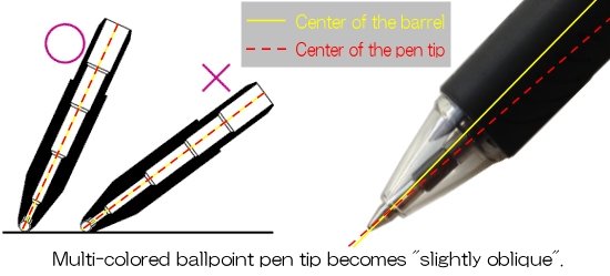 - Multicolor ballpoint pens are equipped with the refill of each color at a position away from the center of the barrel. Therefore, when the pen tip is extended, the pen tip of each color becomes "slightly oblique" toward the center of the barrel. In the above picture, the yellow line shows the center of the barrel, the red dashed line shows the center of the pen tip (the side close to the writing surface). As a result, even with an angle at which writing can be done without problem even with a single-function pen, with "multicolor ballpoint pen" "only the refill on the side close to the writing surface" becomes the further angle, may wear out on the paper surface, causing ink leakage.