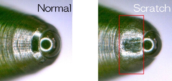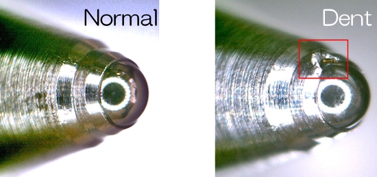The pen tip has a very delicate structure in which a fine ball is assembled at the tip of a thin metal pipe. Therefore, even if you penetrate an object with a pen tip or drop it from the pen tip onto the floor, the pen tip will be damaged, in some cases the pen tip will deform and the ink may leak out.