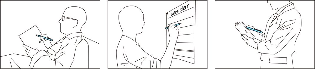 As in the illustration above, when you write with the tip of the pen pointing more than horizontal, air enters from the pen tip and ink falls. If you leave the pen in this state, air may enter further from the pen tip and ink may flow out at the end of the pen.