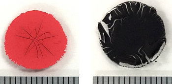 If ink is applied thick like a drop, cracks may occur and peel off due to the time difference between the outside of the ink which is easy to dry by touching the outside air and the inside which is difficult to dry. The photo shows POSCA PC-5M (water based pigment ink) left for half a day after ink is poured out onto a transparent plastic plate as a drop. ※The scale of the ruler is 1 mm.