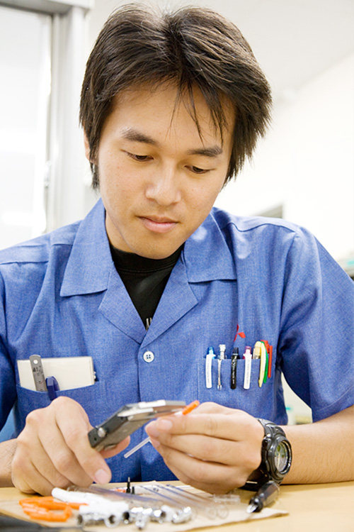 「理屈上では動くはずなのに途中で止まってしまう。そんな原因もわからない問題に対して、試行錯誤しながら突破口を探り続けました」。部品を足したり引いたり、油を足したり取ったり、ある時はカッターナイフで、ある時は工場の機械で部品を加工しながら手作りモデルと向き合う。Iの作業は毎日のように続いた。