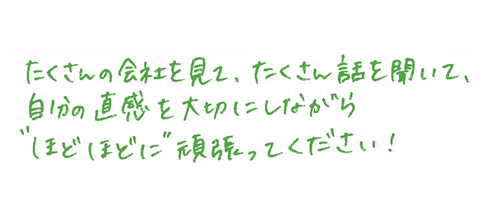 - 就職活動中の学生にひと言アドバイスをお願いします。