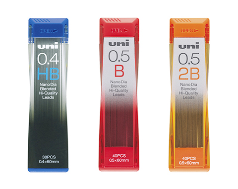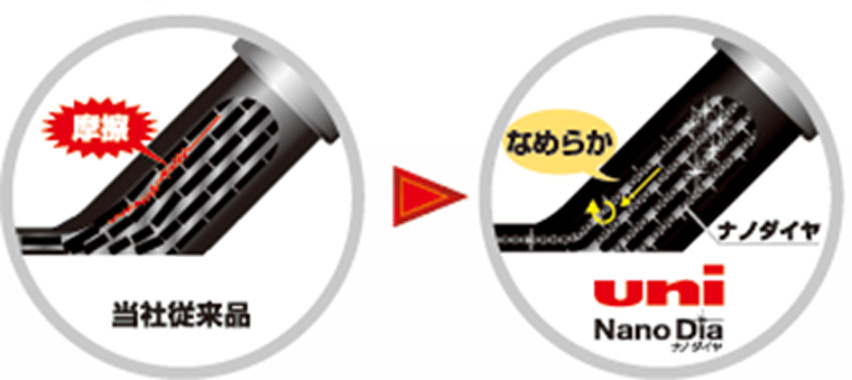 芯は「なめらかな書き味」と「強さ」といった、相反する両方の品質を重視して設計しなければなりません。シャープ芯の硬度のコントロールは黒鉛種、結合材種、製造条件等、複雑な要因をからめた設計より成立しています。これは、鉛筆芯から始まった長年にわたるカーボン加工技術に蓄積によるものです。最近では、黒鉛と黒鉛の粒子の間にナノダイヤモンドを混ぜる事で、さらに「なめらかで強い」芯を開発いたしました。