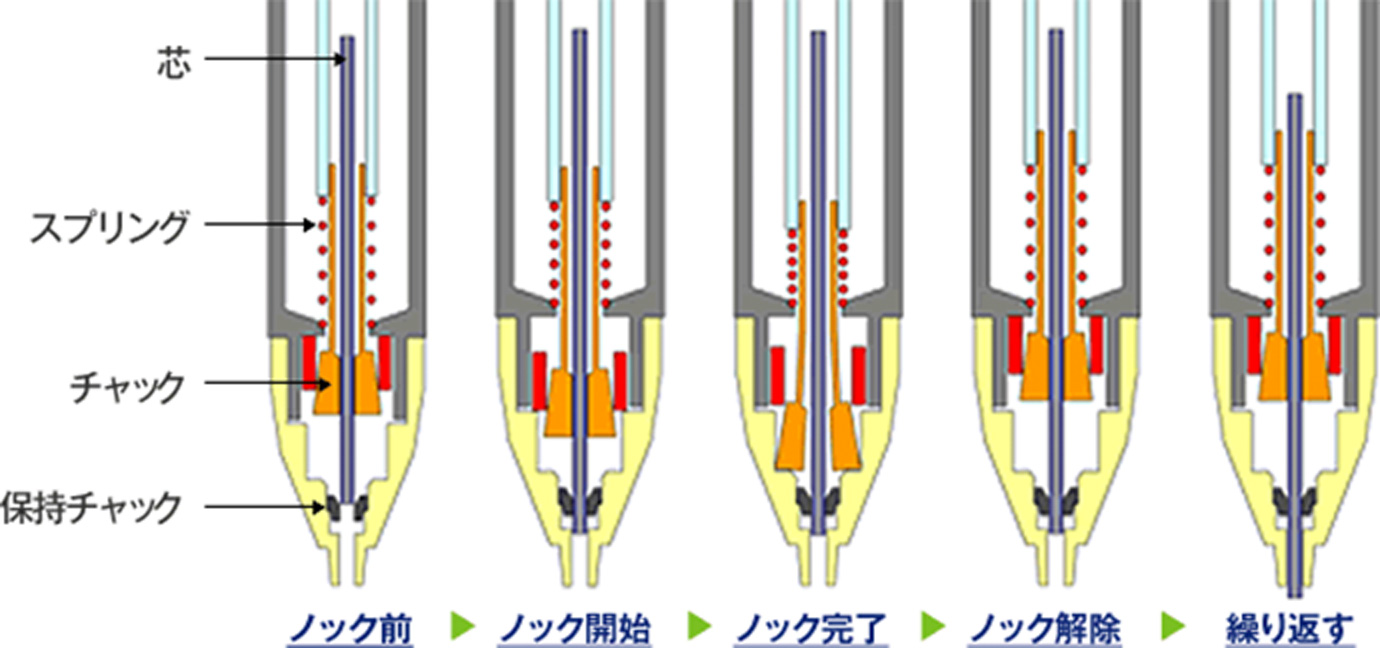 シャープペンシルには芯を送り出し、保持するためにチャック機構と呼ばれるパーツが備わっています。芯ケースに入れられた予備の芯は重力によって芯ガイドに供給され、三ツ割(二ツ割)チャックが一定量の芯を送り出し、保持チャックによって芯が固定されます。こうして細い芯が安定的に使用できるよう工夫がなされているのです。