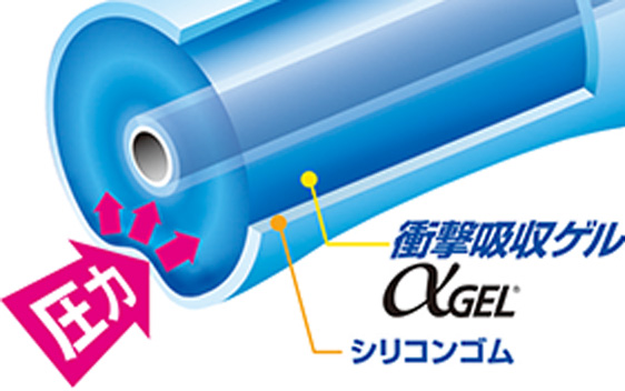 「書いても疲れない」、「書きやすい」といったペンの使用感を追及するために、グリップにはシリコンや木材など様々な素材が使われます。当社では、地上18mから生卵を落下させても2cmの厚さで割らずに静止させる事が出来る特殊なゲル状素材「αGEL(アルファゲル)」を用いた商品があります。