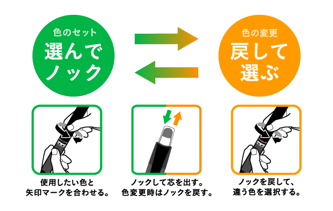 「熱消去性インク」を搭載したボールペン 回転セレクトノック機構と金属製のリフィルによりスリムな軸を実現しました。