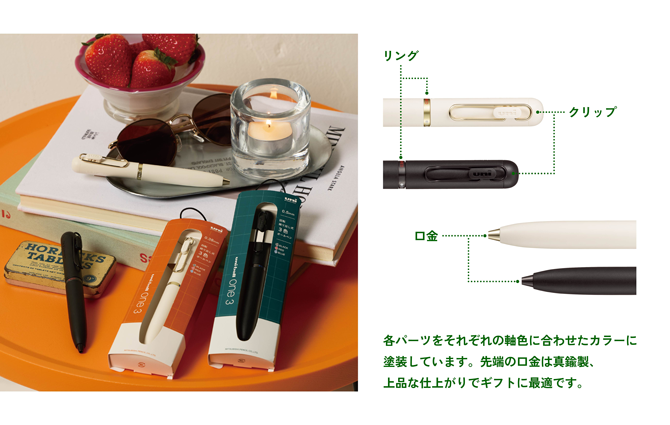 oneシリーズの濃いインクはそのままに、デザイン性と使い勝手を両立させた、回転繰り出し式3色ボールペン。