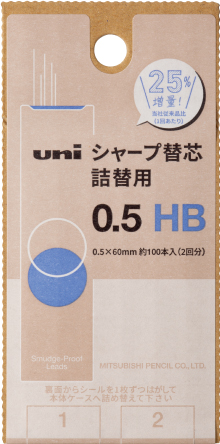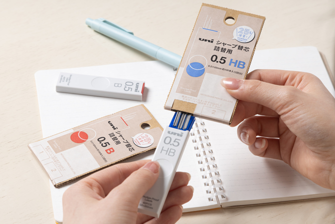 段ボール素材パッケージの「詰替用」です。芯を詰め替えることで、ユニの本体ケースを捨てずに繰り返し使うことができます。