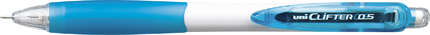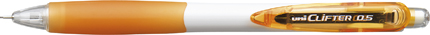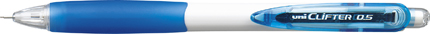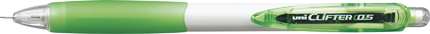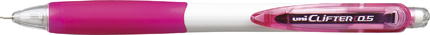 「支点スライドクリップ」搭載で、手帳やノート・書類の束など厚いものでもぴたっとホールドできるシャープです。キュートなデザインの白×カラータイプは名入れが映えるためノベルティとしても好評です。