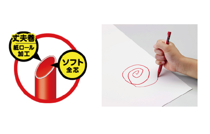 特殊な丈夫巻(紙ロール加工)を芯に施しているので、筆圧の強いお子様が思いっきり描いても折れにくい強度を実現しました。