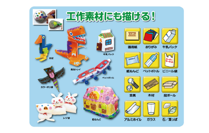 プラスチック・金属・ガラス・木・石など様々な素材にくっきり描けるので、工作に最適です。