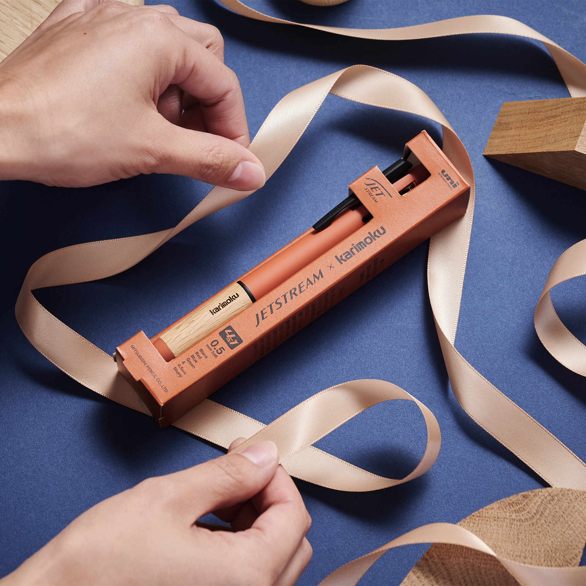 木製家具メーカー「カリモク家具」とのコラボレーションアイテムは、個性的な贈り物にも最適です。家具製造の過程で生じる木の端材をグリップに再利用し、手元から家具品質の触り心地を味わえます。