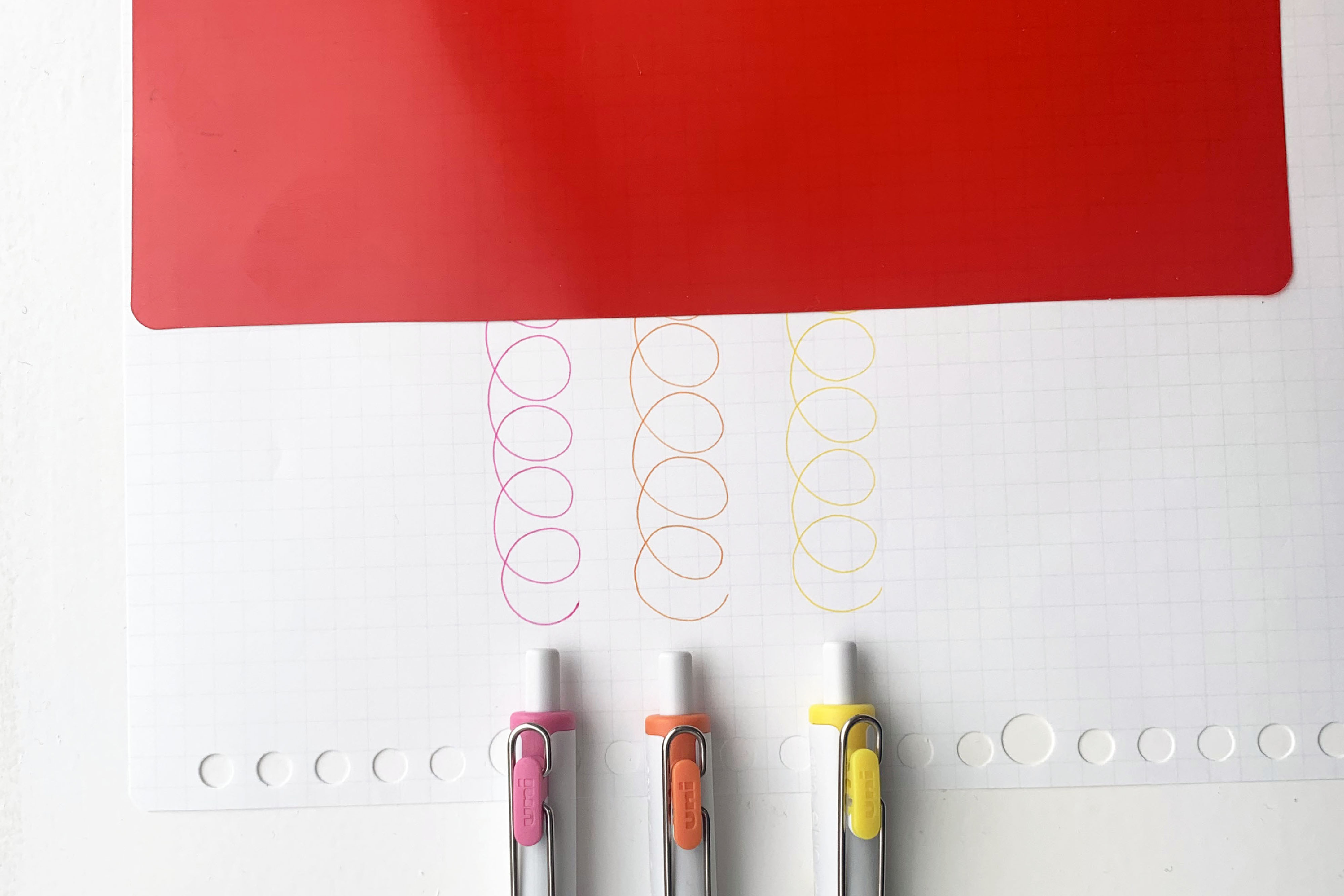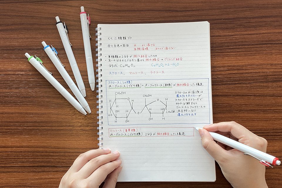 暗記勉強に適した、“ノート、くっきりキマる。”ボールペン。赤シートでも消える色もあります。