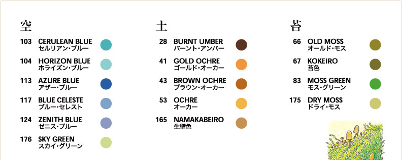 色の名前には、自然物から写し取ったものや顔料や染料など色材に由来したもの、あるいは文学的に表現されたものから商業的な目的でつけられたものまで実に多様です。色名は時代とともに自然と淘汰され、現在、私たちが目や耳にしているのは、今を生きている色名なのです。