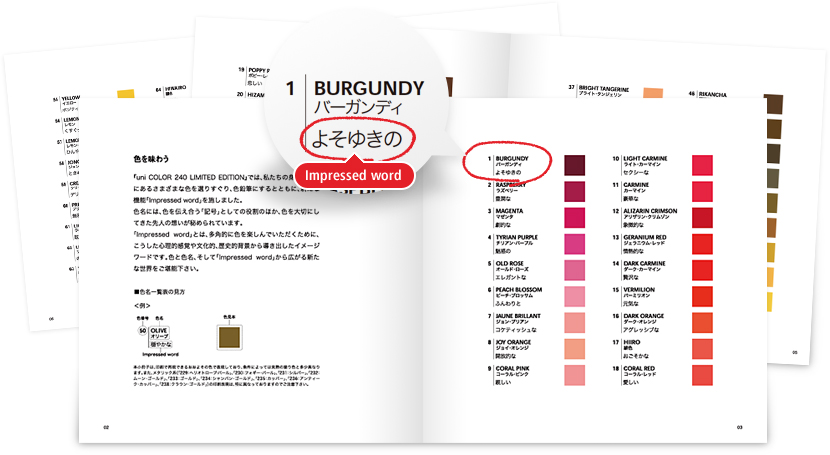 『uni COLOR 240 LIMITED EDITION』では、慣用色名や、伝統的なもの、さらに近現代に名づけられ、次の時代にも引き継がれていくであろう色名を選び名づけました。