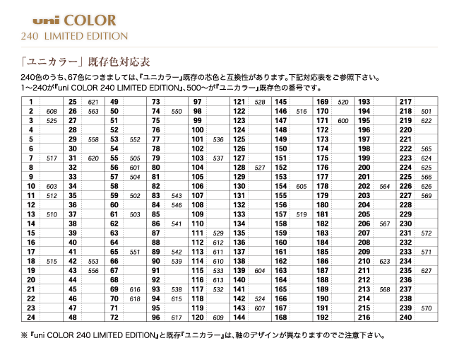ただし、『uni COLOR 240 LIMITED EDITION』と既存『ユニカラー』は、軸のデザインが異なりますので、ご了承くださいませ。 既存色対応表 |