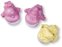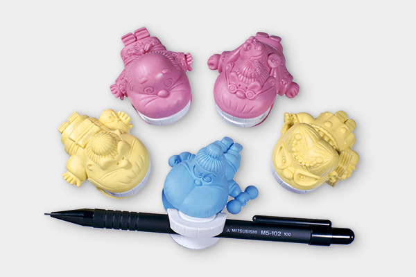 「およね」「おかね」「おくま」「おたけ」のおばあちゃん4人と、「吾作」という1人のおじいちゃんの消しゴムです。シャープや鉛筆に名前のとおりかみつかせることができ、またその入れ歯がはずれるユーモラスな姿が楽しめます。