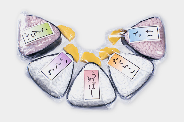 こんぶ、たらこ、さけなど5種類の具のおにぎり型消しゴム。おにぎりの上に沢庵がのっているという芸の細かさ!