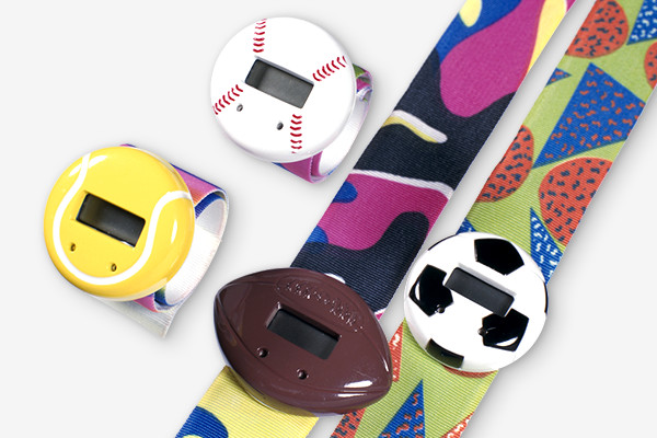 ベルト部分を腕にパチンと軽く叩き付けると、バネの力でぐるりと巻きつく面白デジタル時計です。文字盤の部分は野球、テニス、ラグビー、サッカーなどのボールがデザインされています。