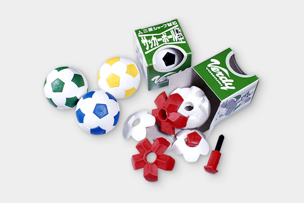 バラバラにして組み立てパズルにもなる、サッカーボール型消しゴム。