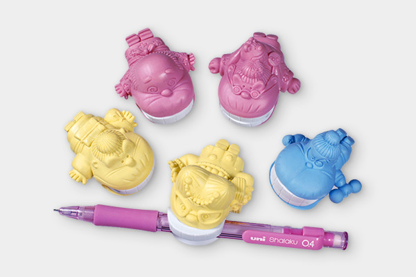 そのまま使えば消しゴムに、シャーペンに差し込めばゴムグリップにもなる、ゆかいなプレミアムです。鼻先や頭のてっぺんからシャープの芯がツンツンと出てくる楽しいキャラクターは「ツンツンイカ」「ツンツンサボテン」「ツンツンザメ」「ツンツンキツネ」「ツンツントプス」の5種類です。