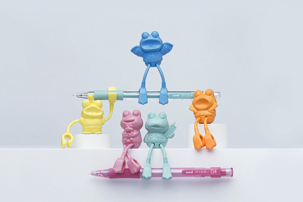 小さいカエルを家に「連れてカエル」、携帯電話で帰るコールしている「いまからカエル」、「とのさまガエル」、はっと「われにカエル」、「とんでカエル」の5匹のカエルです。本体の部分は消しゴムで出来ており、ブラブラしたカエルの手足で、シャープペンシルの軸などをつかんだり、ぶらさがったりすることができます。