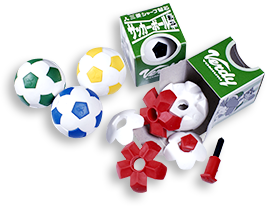 5色のカラー(黒・黄・青・赤・緑)を揃えたサッカーボール型の消しゴムは、バラバラにすることもでき、組み立てパズルとしても遊べます。