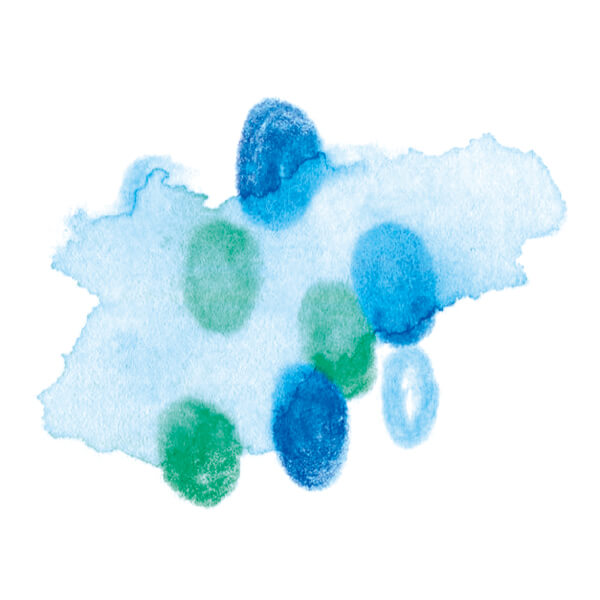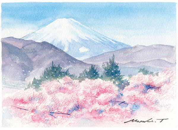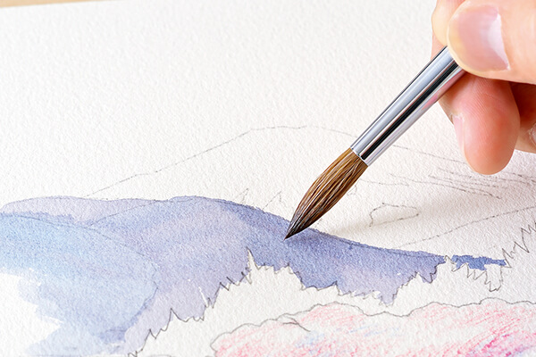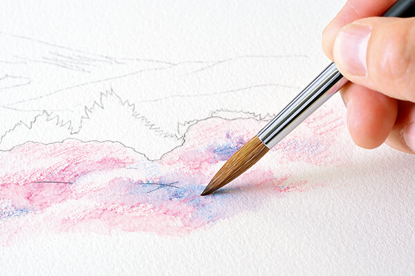 筆に色を取って描くと、より水彩画の風合いを楽しめます。色を混ぜる場合は、パレットの上などで取った色同士を混ぜ合わせます。