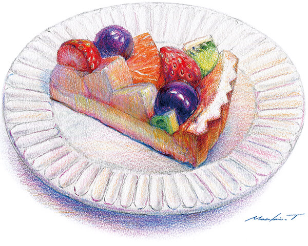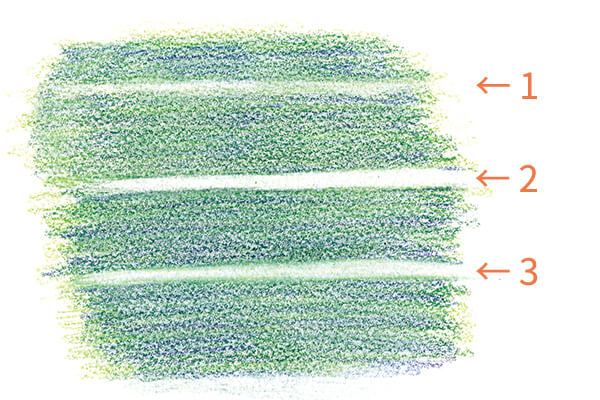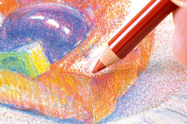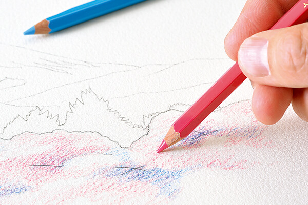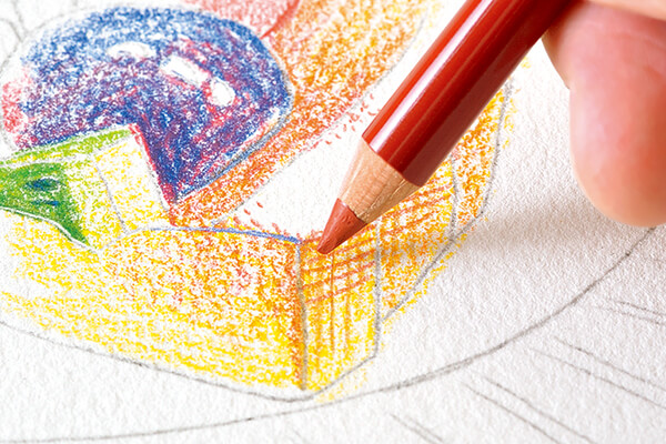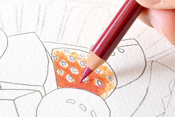 色鉛筆を立てて線を何度も重ねて描いていくことで、影や質感の表現ができます。