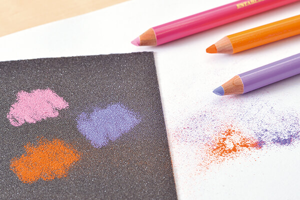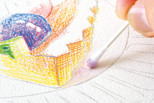 綿棒で粉をとって塗ると、柔らかなタッチになります。また様々な色の芯を削って混ぜることで複雑な色味を表現できます。