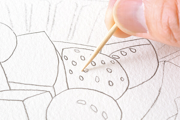 色鉛筆を立てて軽く紙に打ち付け点を重ねると、素材の凸凹感が出せます。明るい色からはじめると上手に描けます。