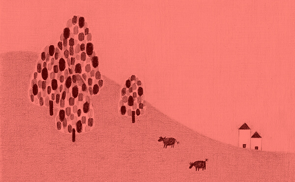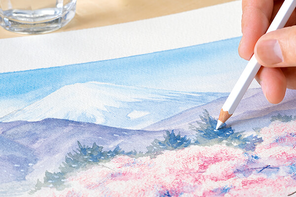 濡らした筆でなでるように触れると、色が混ざり色鉛筆画と水彩画タッチが混ざった表現ができます。