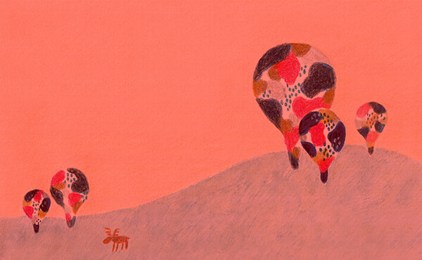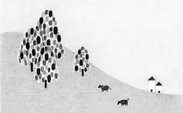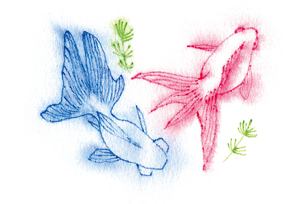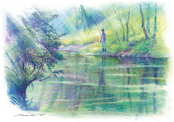 あらかじめ濡らした紙に水彩色鉛筆で線を描くと、にじんだタッチの表現ができます。