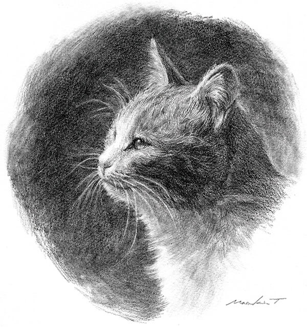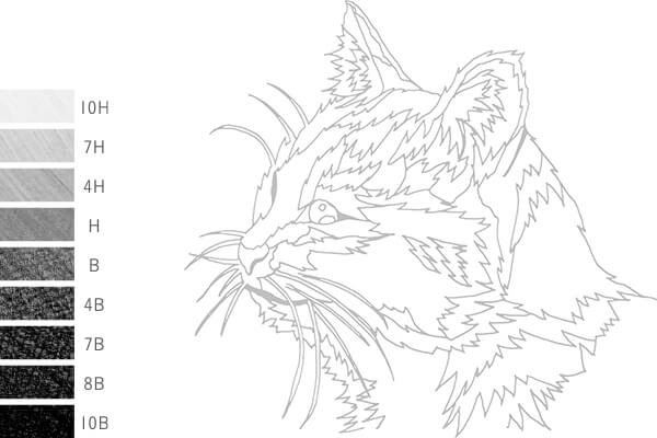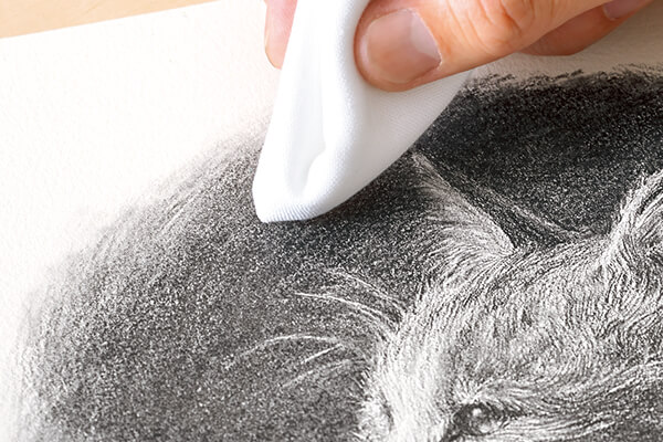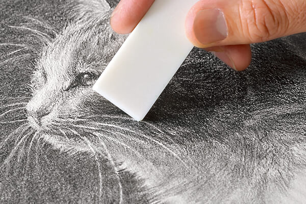 鼻などの広く光の当たる部分は8H〜10Hで塗り、ヒゲは全体を塗った後消しゴムで細く消すと表現できます。