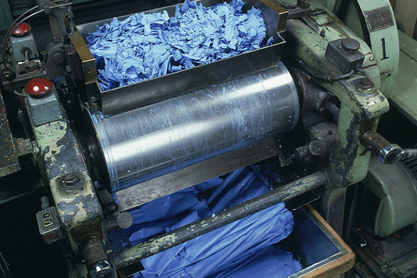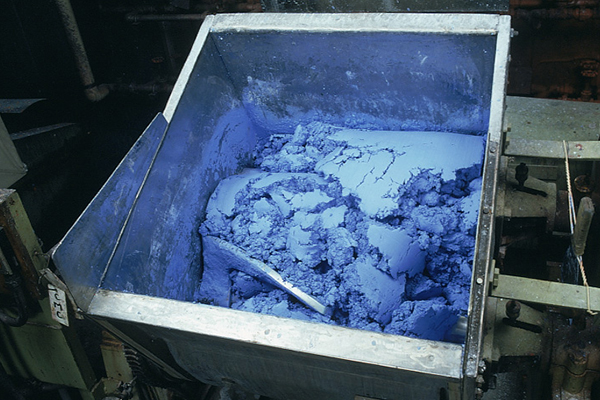 2 すりつぶすよくまぜられた原料(げんりょう)を、さらにこまかくすりつぶし、ねり合わせます。